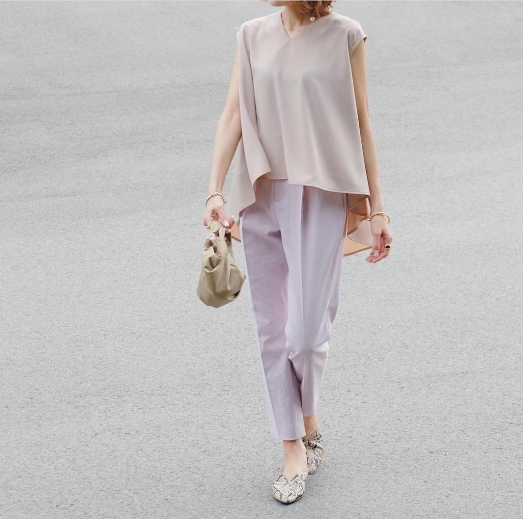 ⑤夏天我们可以选择的色系真的是太多,对于一个成熟的女人来说,烟雾紫色和薰衣草紫色,都会让人感觉清新婉约一些。只是在穿彩色时,记得要将配色差异和面料呈现出的不同光泽,这些细节考虑进去。轻薄的V领T恤衫+九分西装裤,利落的剪裁融合着靓丽的色彩,尽显温柔女人高级本色,浓淡相间,美轮美奂。