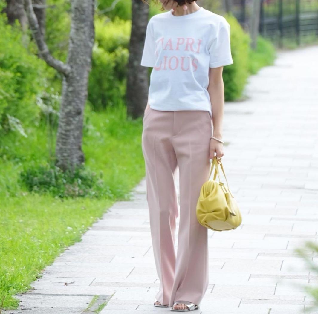 ⑥若是你每次尝试彩色系穿搭、都难免会稍显浮夸,那就将彩色作为小面积去使用吧。这里的搭配你可以借鉴,白色字母T恤+粉色西装裤,休闲洒脱又不失甜美,字母颜色和裤子颜色呼应一致,所以看起来十分协调。她还特意拎了一款黄色的云朵包包,文艺雅致的传递,是这套Look的重点。
