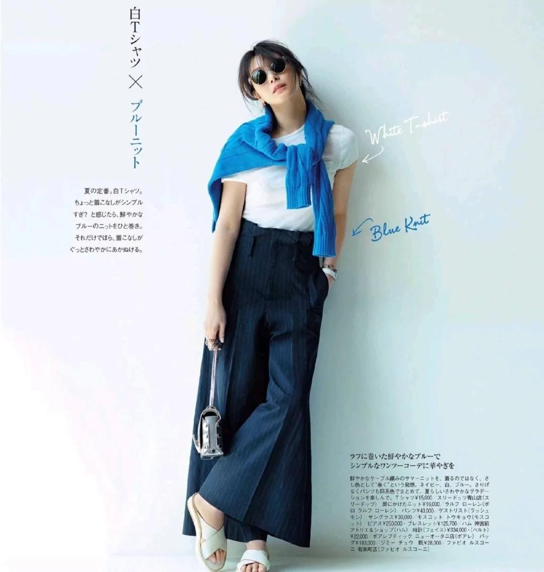 White T-shirt + dark blue high-waisted wide-leg nine-point pants, the chic look doubles the lightness. Regardless of the dark background of the trousers, as long as they are paired with a sky blue shawl as an embellishment, you can easily filter out the old-fashioned atmosphere. Emphasizing the high waistline, tightening the top and loosening the bottom, exposing the slender neck and arms, these casual details hide the secret of making you look taller and slimmer, betraying your dressing skills.