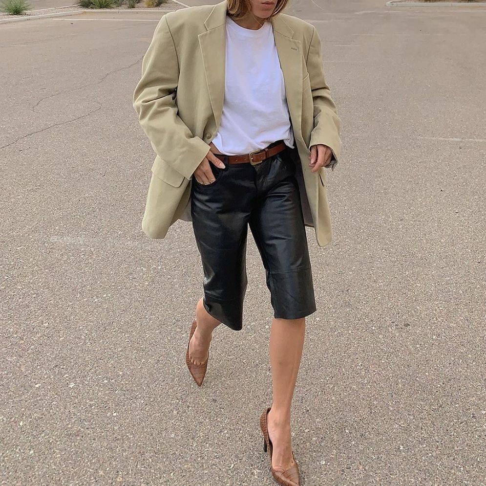 The set just now is a combination of hardness and softness, but the look is more masculine. A beige green suit, thanks to the Oversieze shape and strong shoulder pad design, has lost its cute and fresh shell and turned into a neutral item. Pair it with a white T-shirt to purify the edges and black leather shorts to inject a cool and cool look, creating an elegant and elegant look.