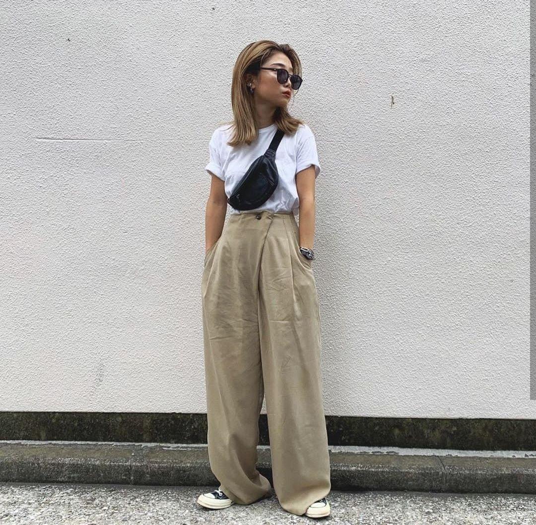 White T + khaki pants, this color combination alone is enough to make people think about it endlessly. The wide-leg trousers in the picture above are quite eye-catching. The wide trouser legs, the length that reaches the ground, and the high-waist staggered buckle design inspire the wearer’s inner yuppie and cool personality.