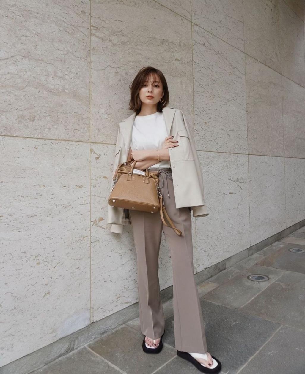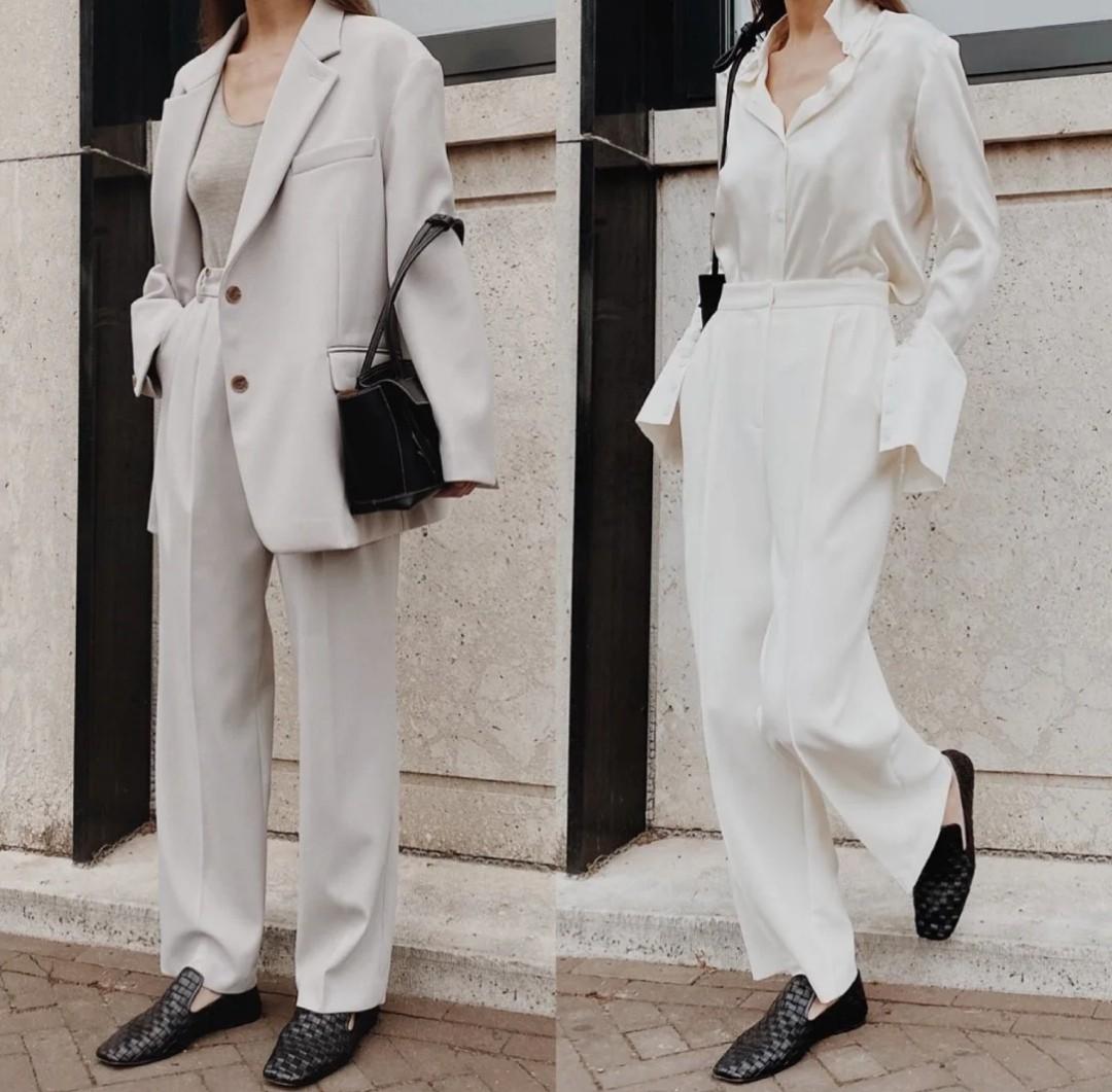 Off-white suit + white T + milky coffee suit pants + open-toe sandals, both neat and straight-line suits, as well as soft and smooth fabrics. The balance of softness and strength makes this look a winning one. Although Morandi colors are used in the color matching, the overall color saturation is low and the brightness is weak, so the exaggerated tonality is not outstanding, but the gentle and feminine style exudes a hint of sharpness and grandeur. Fascinating. Toughness and tenderness are a set of confrontational forces that allow the wearer to switch between different tones at will.