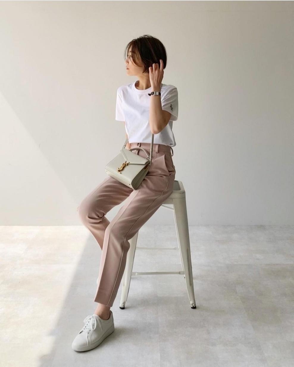 White T+suit pants are an eternal workplace combination, but it is difficult to convey a sense of gentleness. You can change the color of the suit pants to dogwood pink, which is elegant and elegant. There is no lack of capable temperament, using sports shoes and chain bags to balance the casual atmosphere and exquisite beauty. Although it is a minimalist style, it emphasizes the intention at every moment.