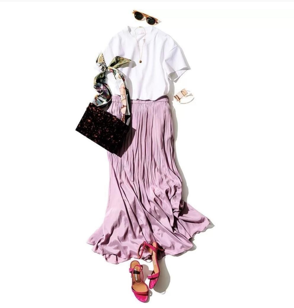 It’s not easy to wear a white T-shirt alone. Pair it directly with a taro purple satin half. The skirt, with simple slim lines combined with delicate and luxurious fabrics, makes the whole person’s temperament gentle and sweet, exuding bursts of fragrance.