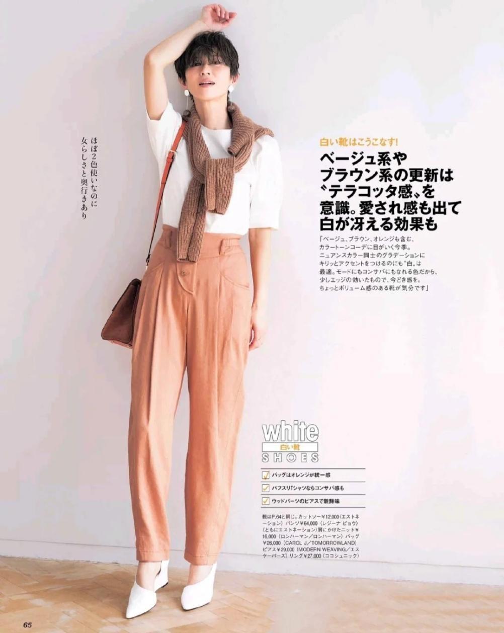 The most popular way to wear it in spring is, of course, a white T+shirt, one piece White T + orange straight pants + white high heels, in terms of color echo, details to raise the waistline, and the combination of clothing size and body curves, they all achieve perfect coordination, fulfilling the agility that big women want in their hearts. Gentle and refreshing. Feel like there’s a lack of layering? Put a brown knitted sweater on your shoulders to bring out the laziness and casualness of an elegant woman. No matter how you look at it, you will look fashionable.