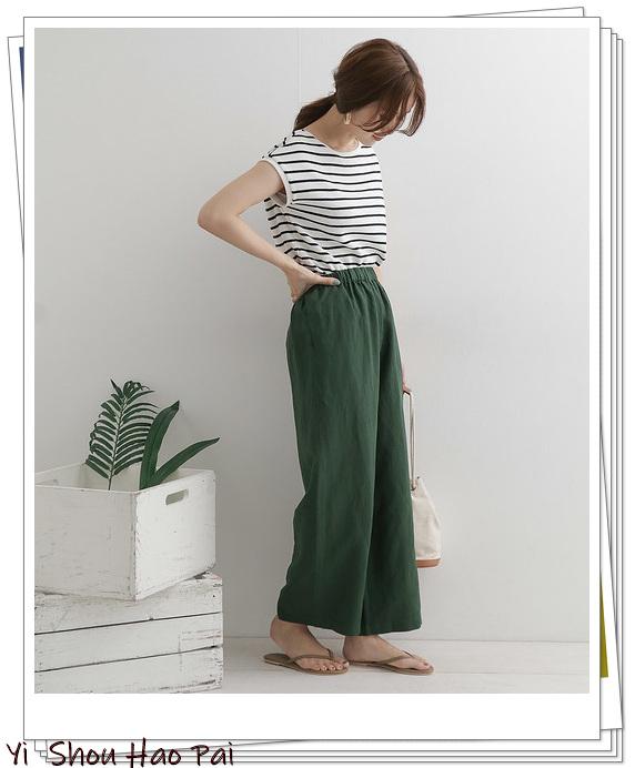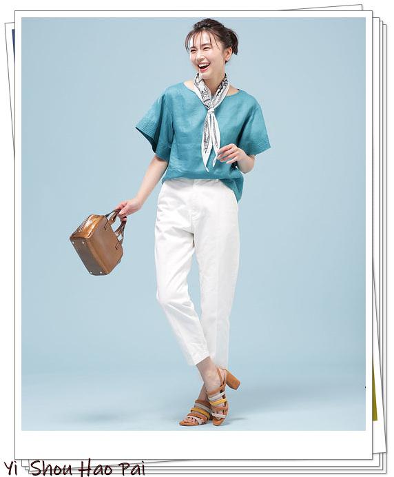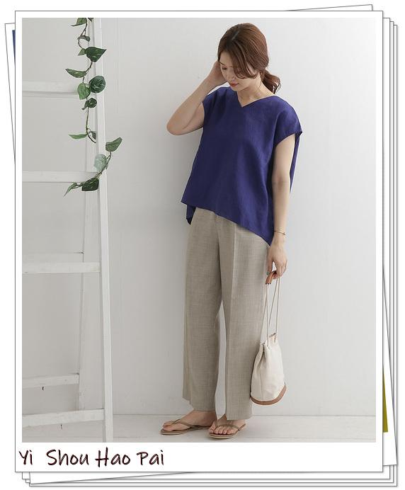 Let’s wear a loose linen top with mid-line pants, V-neck design, short in front and long in back, so it looks good even if it is not tucked into pants.