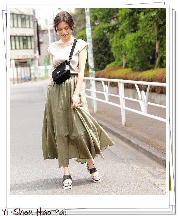 The army green linen skirt balances a soothing impression and cuteness. Wear a sporty shoulder bag cross-body to become a summer-ready woman.