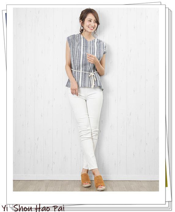 The sleeveless striped linen top has a refreshing marine style. The string strap at the waist is placed very high, so it is also a piece that can lengthen your legs.