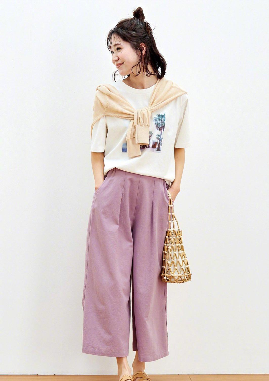 This set is very fashionable , first a white printed T-shirt paired with pink wide-leg pants, the color is sweet and age-reducing, and the gentle style is fully displayed. Wearing a light yellow long-sleeved shawl casually on the shoulders will instantly enrich the overall layering and enhance the overall fashion. The trousers on the lower body belong to the category of nine-point wide-leg trousers, which are comfortable, breathable, light and aura.