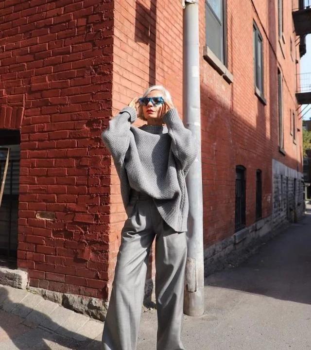 Of course, if you sometimes don’t have any good outfit ideas, you might as well try the same color + Loose style of wearing, such as black and white, gray, khaki, navy and other basic colors, gray knitted sweater + acetate wide-leg pants of the same color. Although the color is single, the materials of the upper and lower garments are different, so you don’t worry about being too boring, but It is very layered and fashionable, giving it a minimalist yet neat high-end feel.