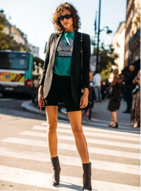 The priorities of this outfit are very good, a pure black suit jacket, black tight shorts and black High-heeled boots, this kind of outer wear is not only very slim and tall, but also adds green leaves to the inner sweatshirt~