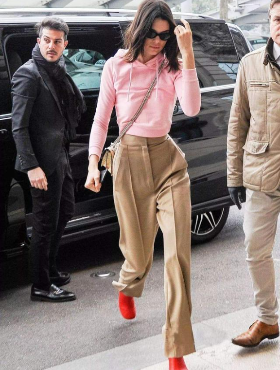 3. Look: pink sweatshirt + high-waisted trousers + red shoes