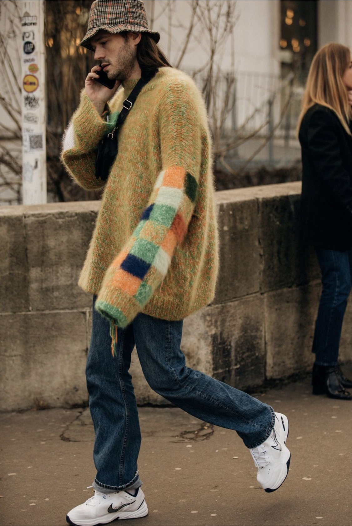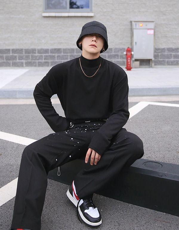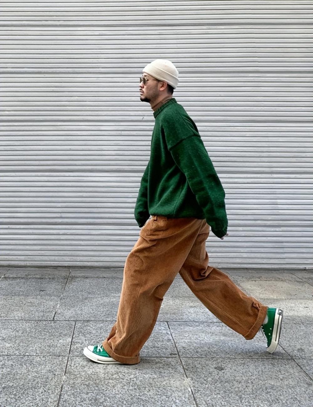 微宽松高领毛衣做上装,不过宽的版型适应能力较强,上身没有一丝丝臃肿气息,内塞穿法来配上高腰牛仔裤,这样的穿搭显示了腰线又突出了比例,配运动鞋或者是马丁靴都很飒,出街满满的个性感。