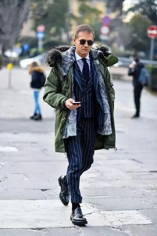 Most of the parkas are full of colors, and simple black cannot fully show the chic charm of the shape. Relatively speaking, green and brown colors have a high appearance rate. Even if they are paired with suits, it is no problem at all. The colors and styles of suits do not conflict with the colors of parkas, and there is no sense of clutter. Although each has its own characteristics, the combination Together they can express their extraordinary charm.