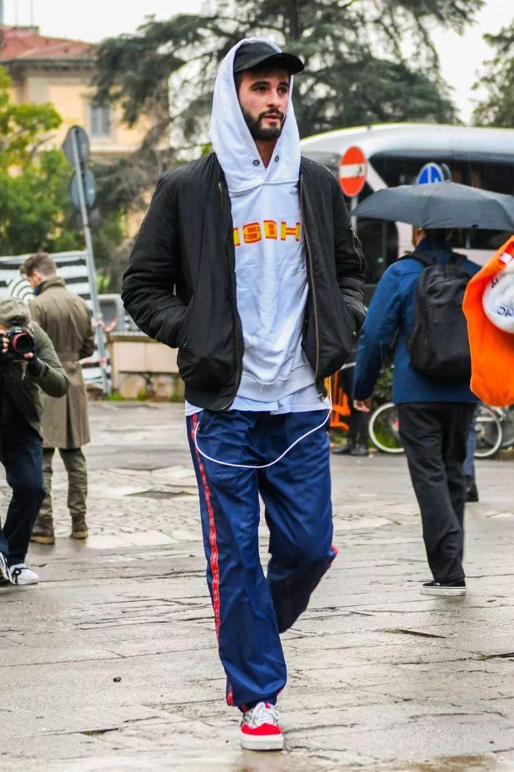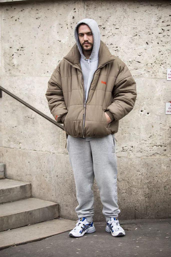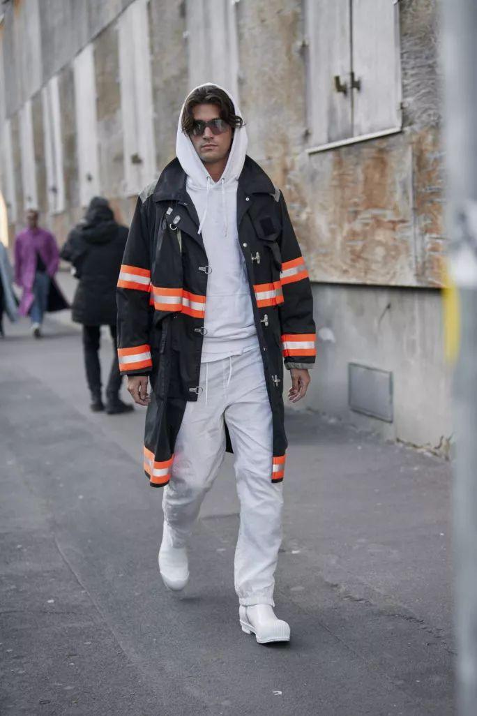Relatively speaking, it is easier to control the style when the sweatshirt and pants are of the same color, and the stacking of hoods and the decoration of the peaked cap will become the visual focus of the style.