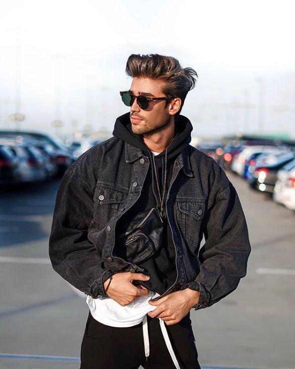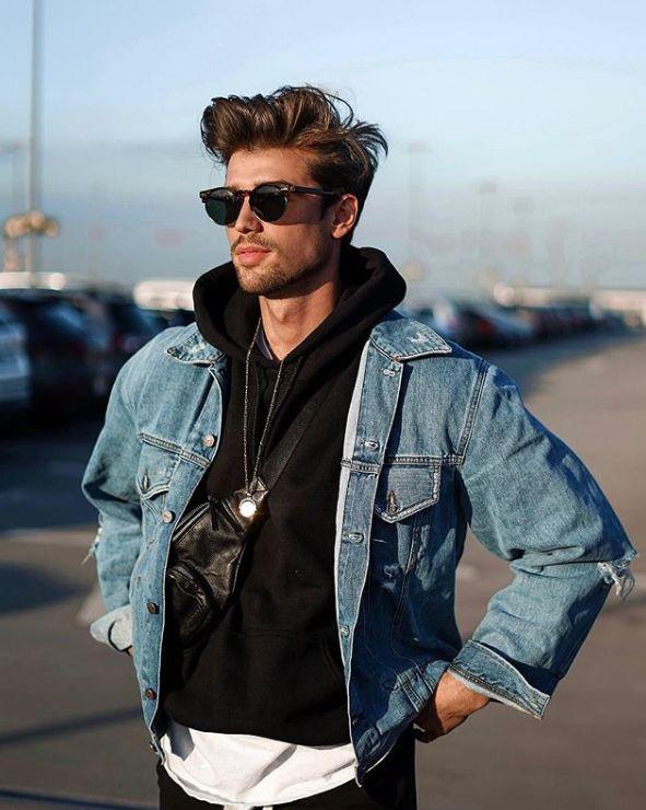 Pair a classic light blue denim jacket with a black hooded sweatshirt. The look is very versatile and is also the easiest to control.