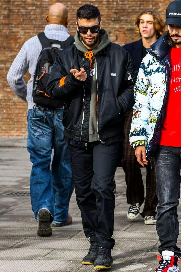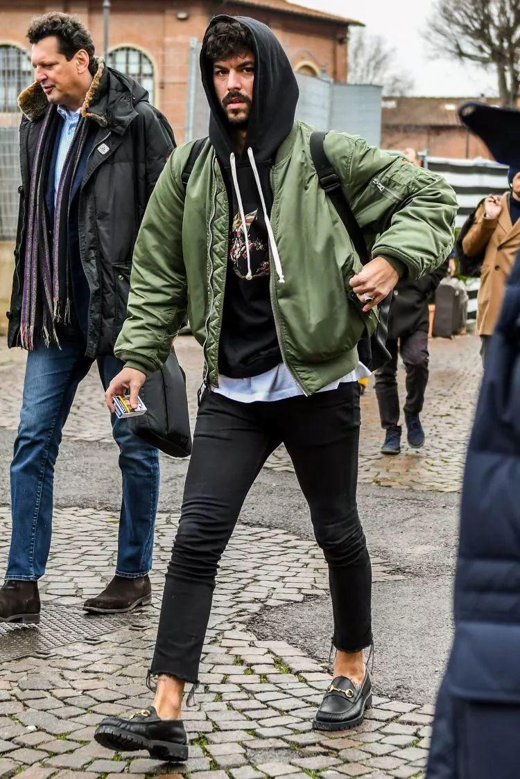 MA-1 and hooded sweatshirts are both very classic items. You can hardly make a big mistake by pairing a military green flight jacket with a black hooded sweatshirt. Choose the right fit to ensure wearing comfort.