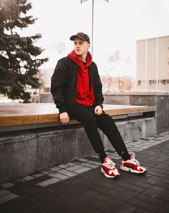 The hooded sweatshirt and jogging pants show a strong sports style, and the trendy hooded sweatshirt and sneakers make the look more fashionable.