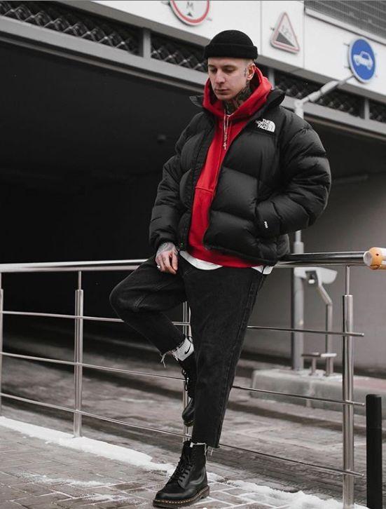 As mentioned above, the red hooded sweatshirt is paired with the MA-1 flight jacket. This time it is paired with a down jacket to improve the warmth of the look, and paired with a pair of jeans and leather boots can also create a sporty street look.