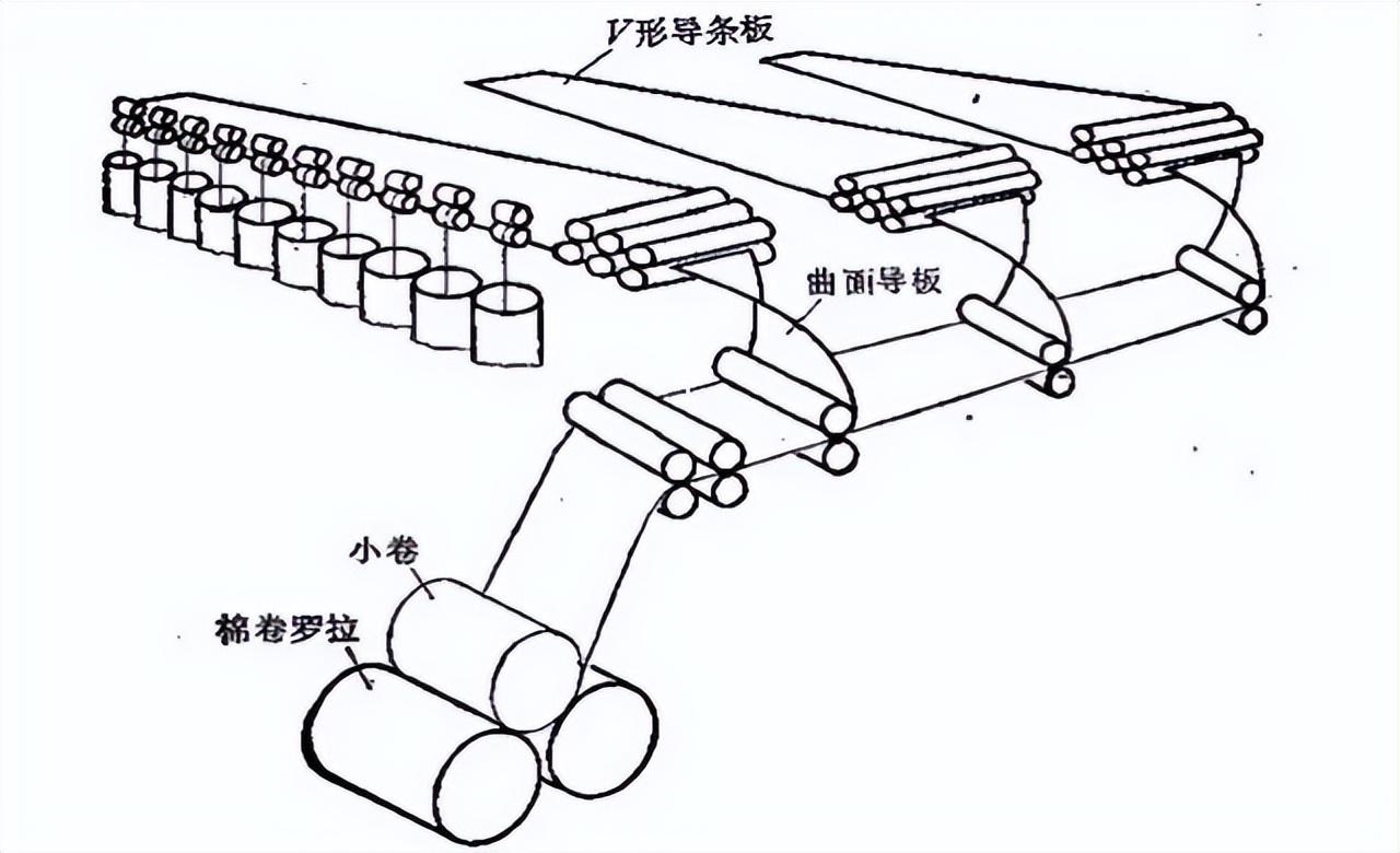 1. Under the guidance of the guide roller and the guide pressure roller, 20~24 cotton slivers are rotated 90° on the V-shaped platform and arranged in parallel.