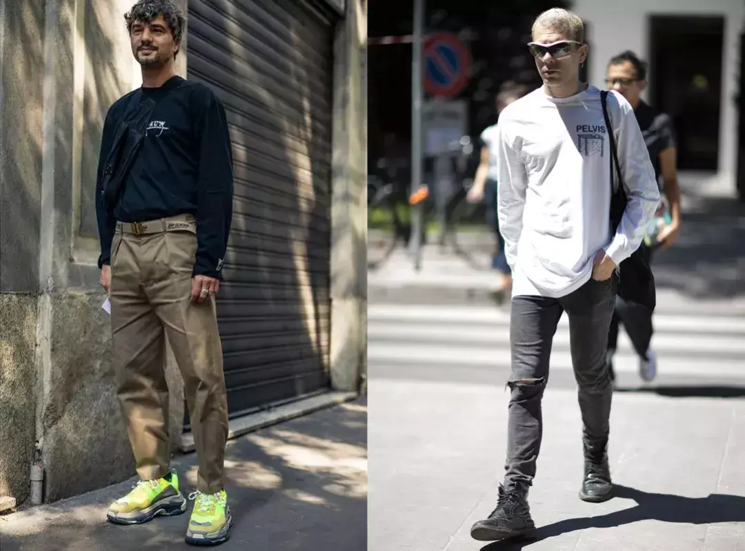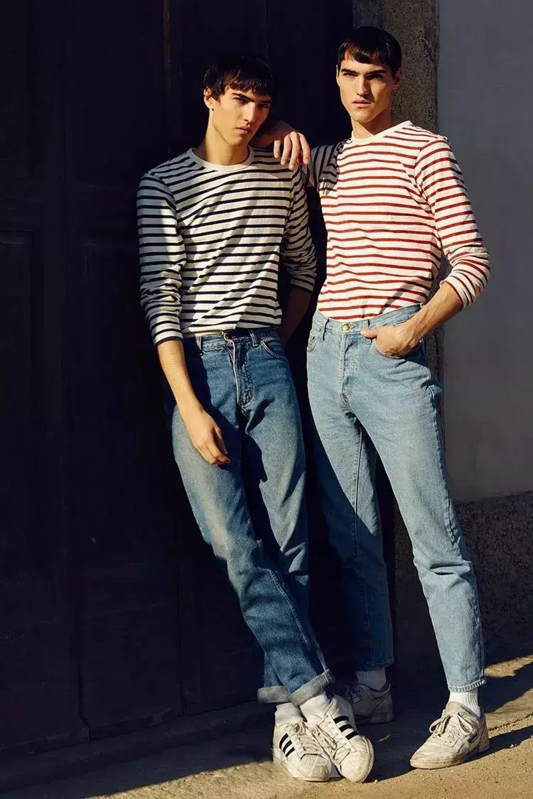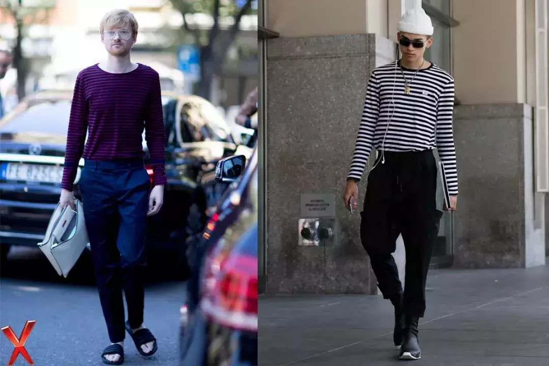 For example, in the case below, two fashionable men wear similar striped long-sleeved T-shirts, but the black and white stripes on the right look more fashionable and decent than the colorful stripes on the left.