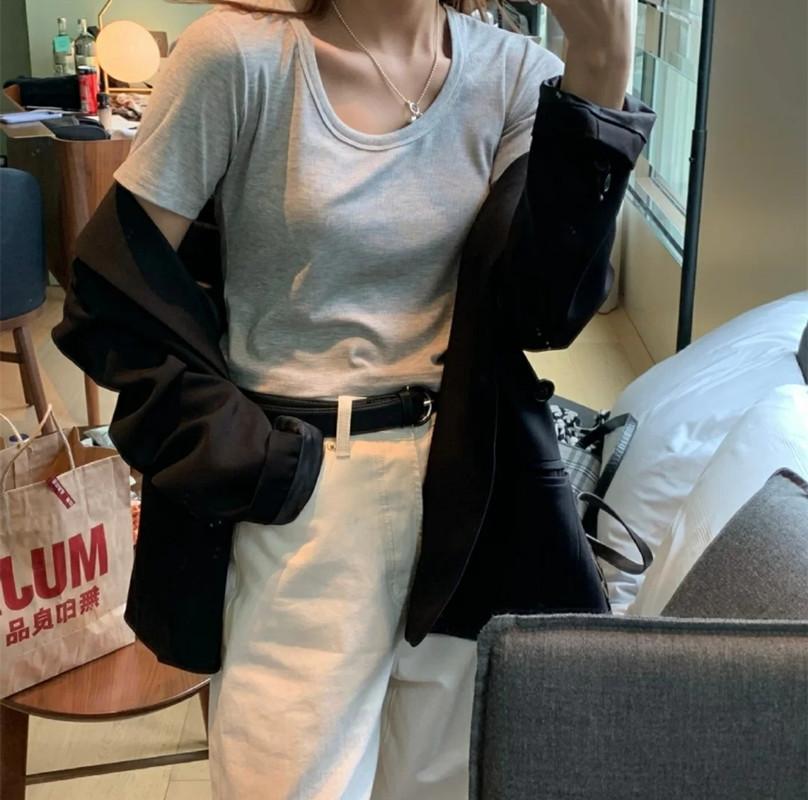 Let’s analyze these two styles with different neckline designs in detail: The picture on the left adopts a regular round neck and a small neckline. The overall visual direction of the design is upward, revealing only a little bit of the skin of the neck. For women with slender necks, superior jaw lines, and thin faces, wearing a T-shirt with a conventional neckline does not put any pressure on the body, and may even highlight the beauty of the neck and face.