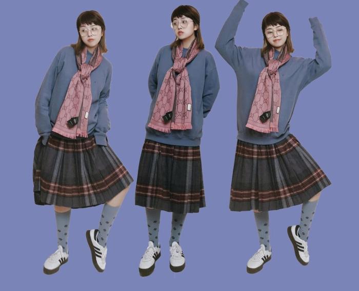 How to wear NO.2: An outfit full of retro atmosphere, a haze blue sweatshirt. Although the sweater is still the same one, but because of the The matching items are different, and the overall shape is changed. This time I chose a retro mid-length skirt, pleated skirt style, which is suitable for anyone to wear. The skirt is paired with mid-length printed socks and a pair of flat sneakers, which is full of girly and preppy style.