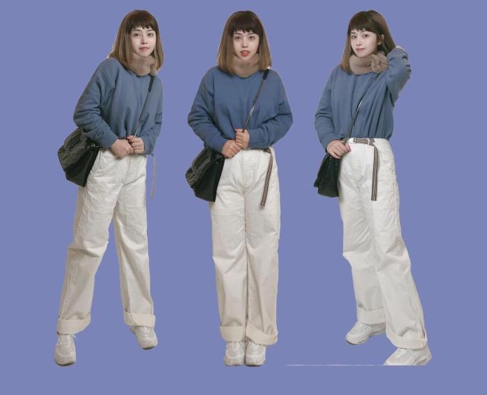 How to wear NO.1: A haze blue sweatshirt that is very popular this year. It is a very simple and versatile style. Wear such a sweatshirt , the bottoms can be paired with such a pair of white straight casual pants, and then step on this pair of white sneakers, which match the color of the pants, and visually have a sense of extending the leg line, with a belt designed with striped elements and a furry scarf. , the integration of these items makes the overall shape no longer monotonous and shows a sense of warmth.