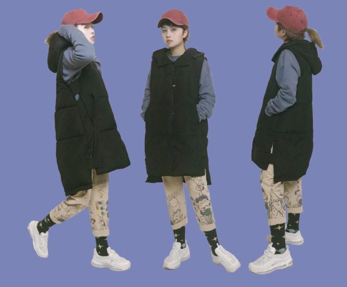 How to wear NO.6: What attracts me most about this outfit is the pants. Casual pants full of childlike charm, really Too loving, right? The top is a sweatshirt + a black hooded vest jacket, and the feet are a pair of star-patterned socks and white sneakers, giving it a youthful and girly look.