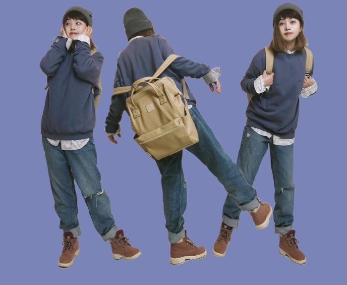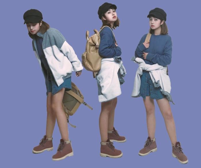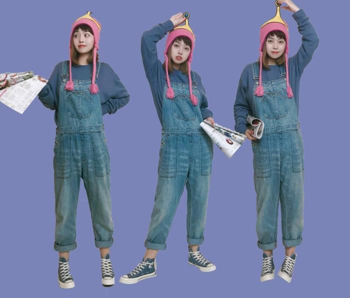 How to wear NO.3: It is really an outfit that reduces age and makes you look younger. There are many ways to wear a sweatshirt. If you don’t like the above two ways of wearing it, what about this one? Choose a pair of denim overalls and a pair of high-top canvas shoes for a comfortable, casual and fashionable look. The knitted hat on her head shows her girly style very well.