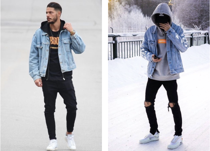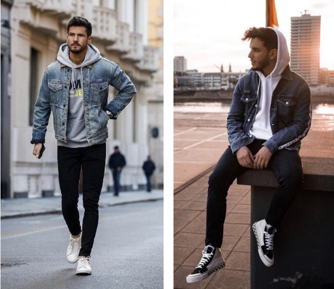 Compared with round-neck sweatshirts, hooded sweatshirts are more suitable for contrasting matching and layering. Combining a sweatshirt with a denim jacket is definitely the first choice. It is versatile and reduces age. It can be said that denim is also popular.A perfect matching item, different denim jackets can also be matched with different feelings. It is best to wear a solid color basic style with basic jeans. A simple combination will make you more refreshing, capable and handsome.