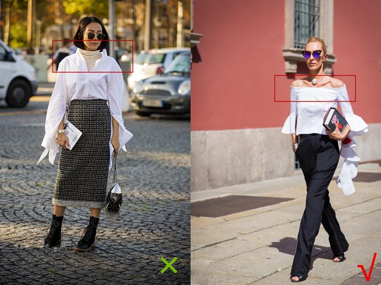 For example, the tightly wrapped neckline in the left picture above will make the upper body look slimmer, while the one on the right The one-line collar top reveals beautiful shoulder lines and makes the shoulders look much wider, which is more suitable for pear girls.