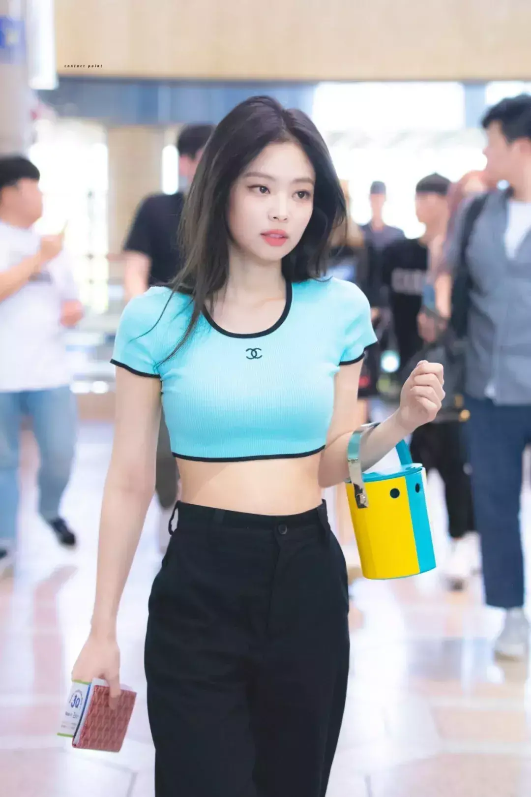 Want to let Are your black wide-leg pants looking more fashionable and attractive? You can pair it with a short belly-baring candy-colored T-shirt like Jennie, and it will be eye-catching.