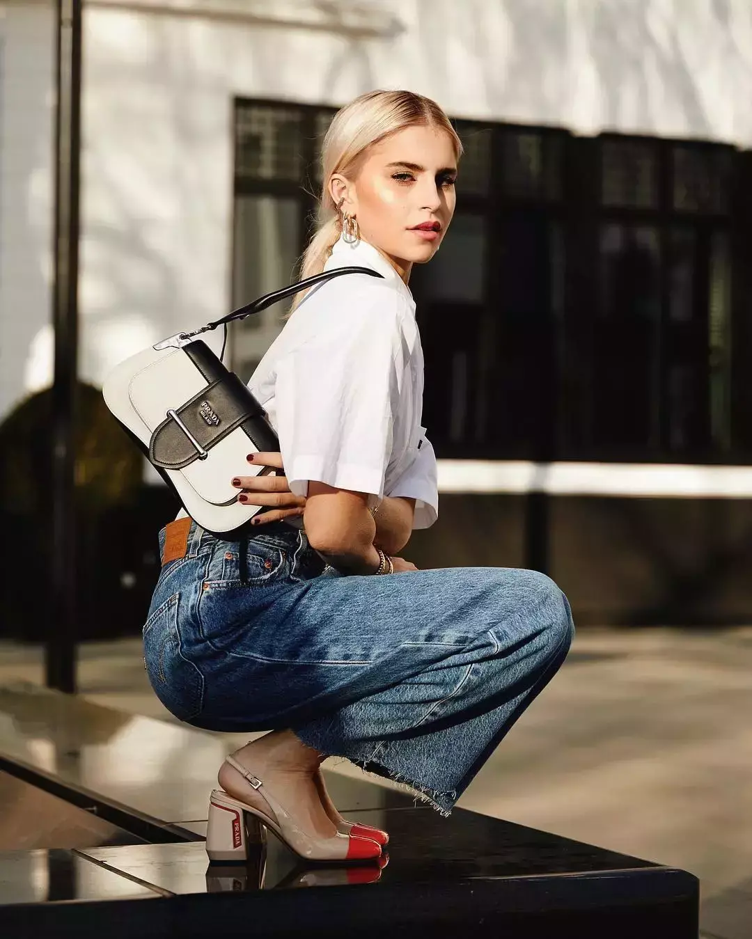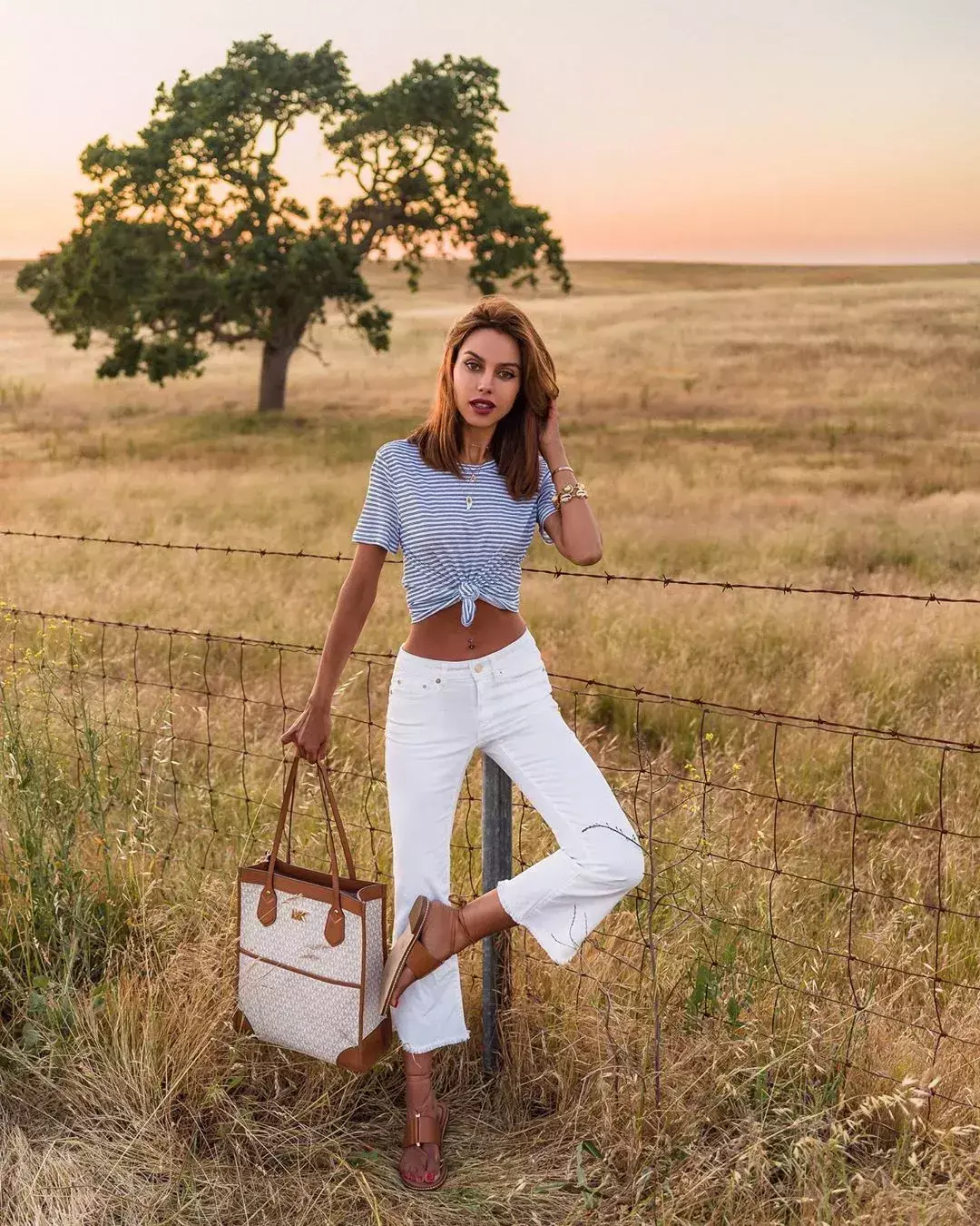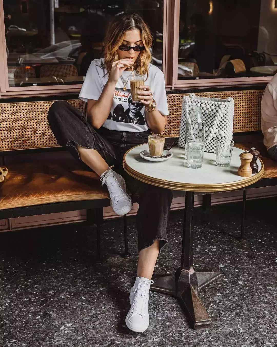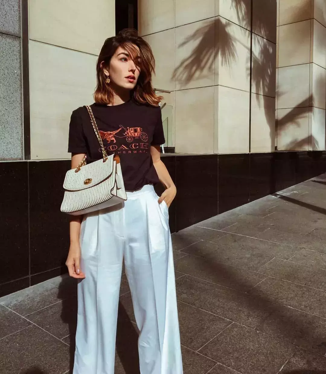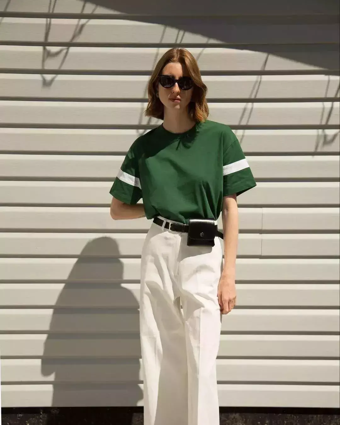 Versatile White wide-leg pants and T-shirts look good no matter how you pair them with each other. Here, Ms. M would like to recommend the combination of striped tee and white wide-leg pants. It can not only create a leisurely and romantic vacation atmosphere, but also play the most French style. Light retro style.