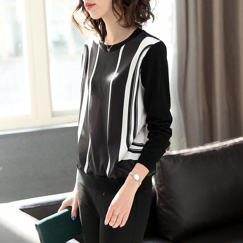 Black and white striped round neck bottoming shirt, very comfortable and comfortable, suitable for all body types, exquisitely shaped, made of high quality Made of high-quality chiffon fabric, the layering can create an elegant atmosphere.