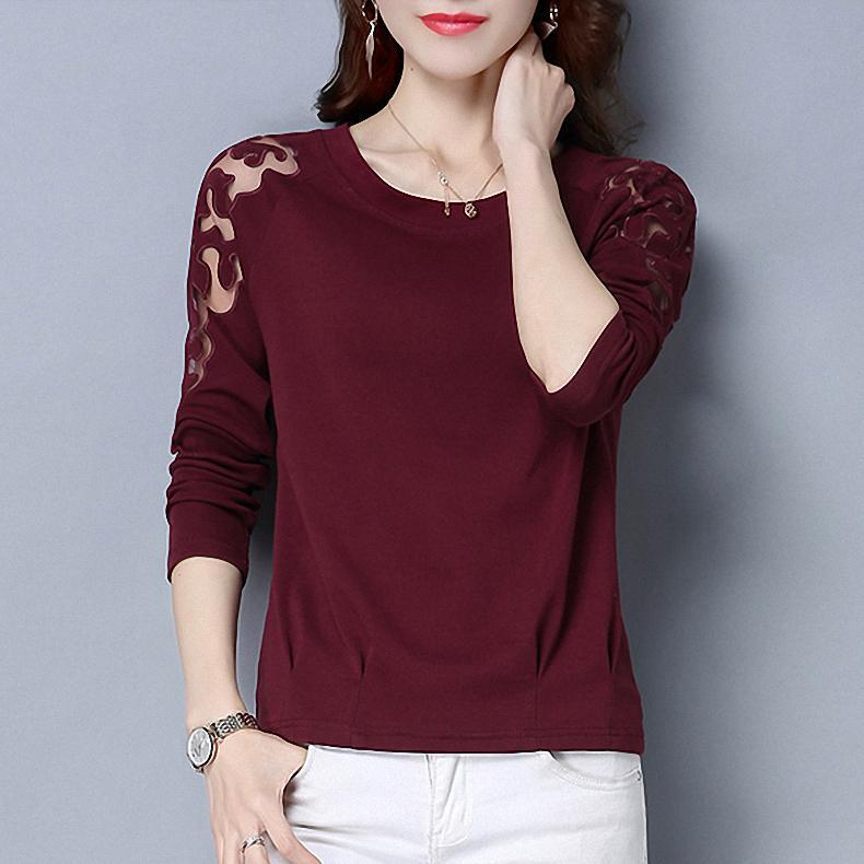 Lace bottoming shirt, very good quality, looks very slim when worn, unique embroidery decoration, shoulder Designed with spliced ​​lace hollow fabrics and a simple round neck cut, it is casual and versatile.