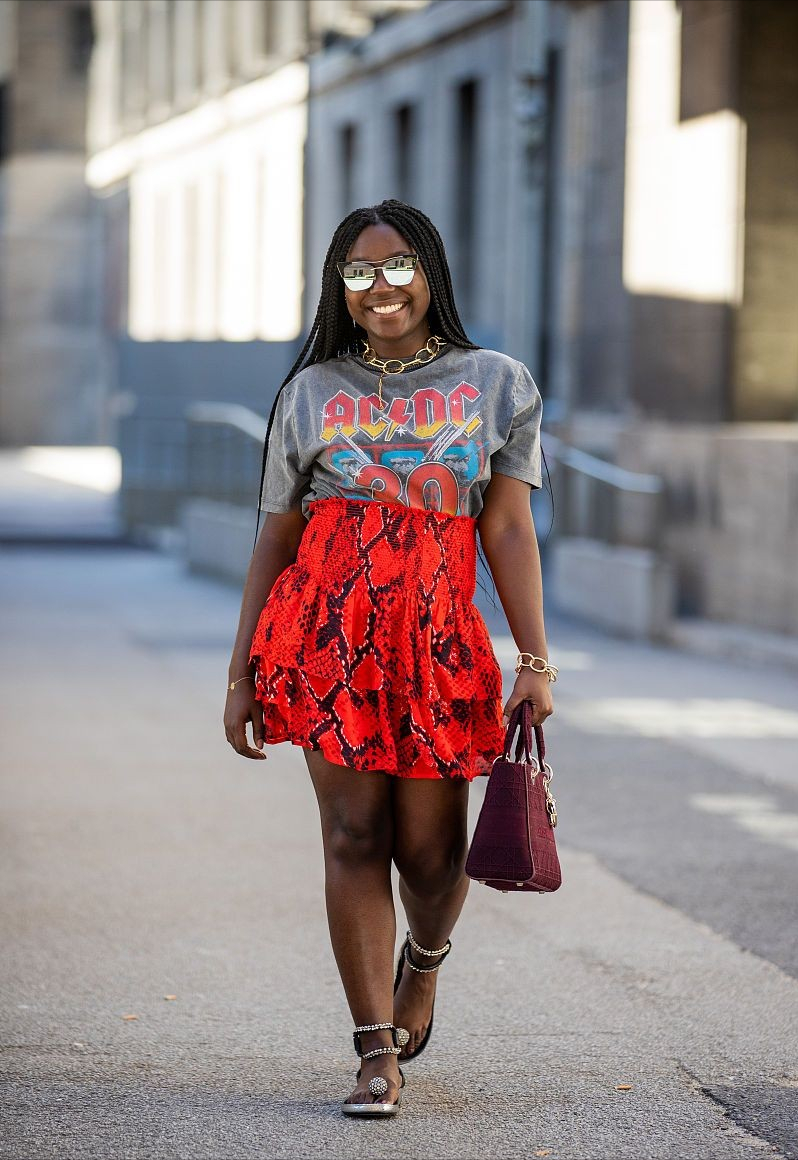 In terms of color selection, if the color of the skirt is fancy, then try to Pair it with a solid-color T-shirt. You can choose a T-shirt in the same main color as the skirt, or you can choose a basic white T-shirt.