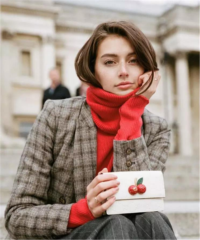 If you don’t want to wear a large area of red, you can also use a small area of red to embellish the entire outfit. The most common one is the red sweater. The red sweater is paired with a gray plaid woolen coat, which brings an elegant temperament in the retro style.