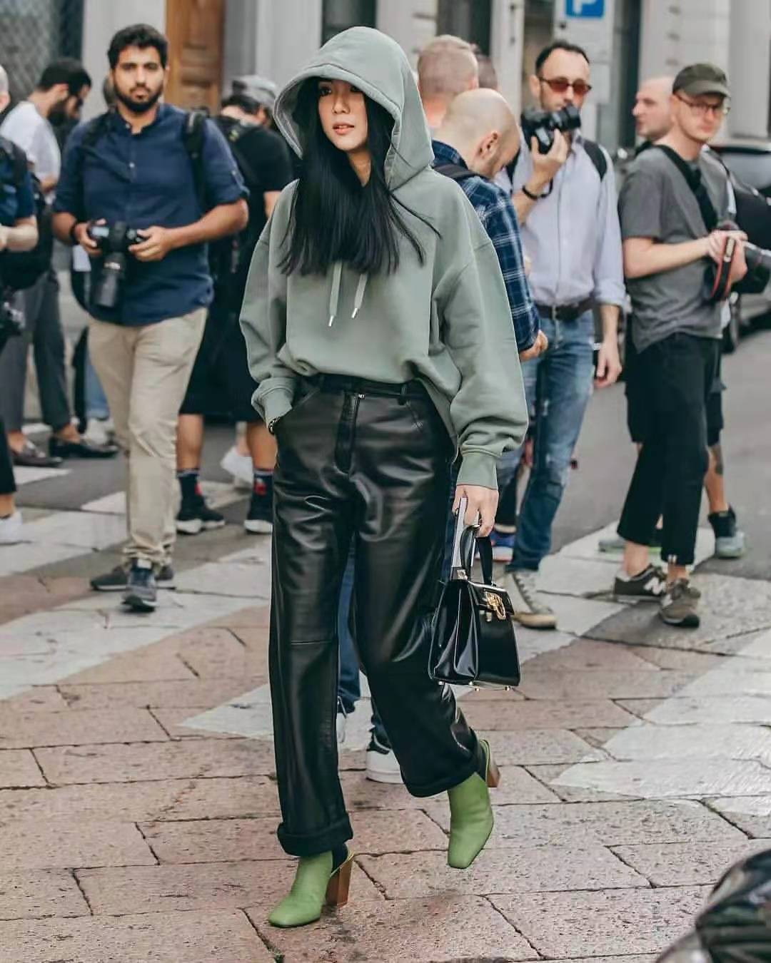 Many fairies like super wide styles, but not all fairies can fit this style. It is difficult to wear without the height of a model. It does not show the beauty of fashion, but it is like walking on the street wearing a blanket. The young lady in the picture chooses a gray-green hooded sweatshirt. The loose fit can easily cover her thick arms, making her comfortable and comfortable. Pair the bottoms with a pair of straight leather trousers, which are chic and cover the flesh. Tuck a corner of the sweatshirt into the leather trousers to easily create a good figure. The loose treatment gives people a very thin image. The green high-heeled short boots on the feet echo the sweatshirt, and the hat of the sweatshirt is worn on the head, which is fashionable and stylish.