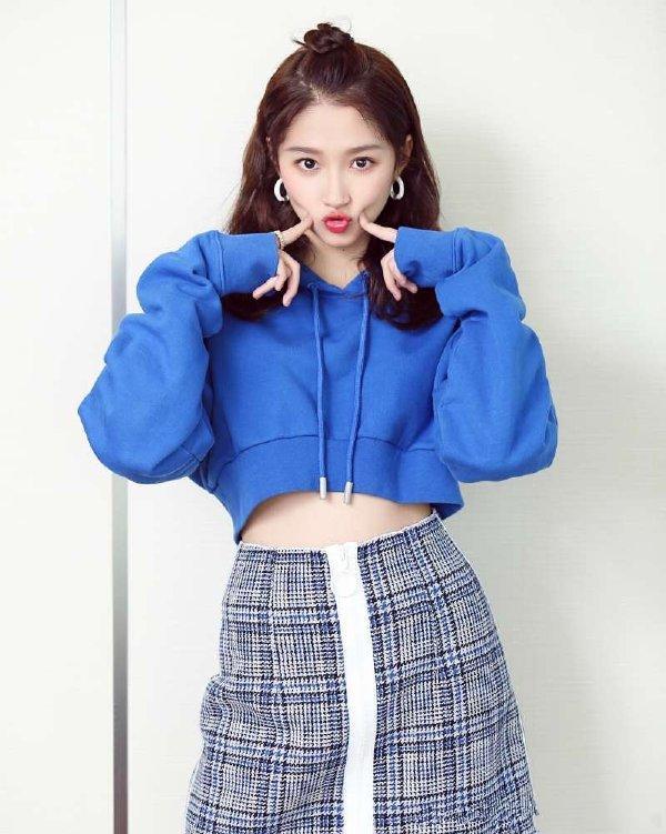 Guan Xiaotong is tall and can do anything with her long legs Wear various outfits. In the picture, she also chose a super short hooded sweatshirt, revealing her fair waist. Even through the screen, you can imagine her super perfect body proportions. The blue design is eye-catching and her pouty look is really cute this time.