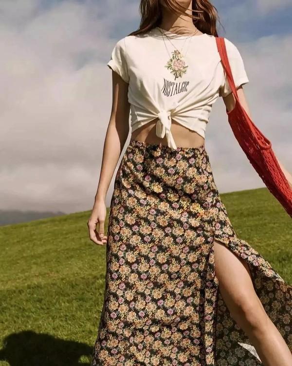 Floral skirts come in a variety of styles and colors. If you don’t like too bright colors, you can choose dark colors. If you have slender calves, you can choose open skirts. The fork-shaped floral skirt perfectly combines feminine tenderness and sexiness, and is extremely beautiful.