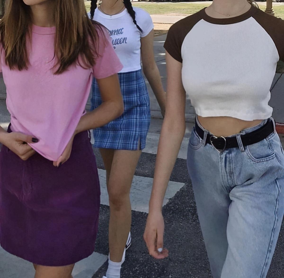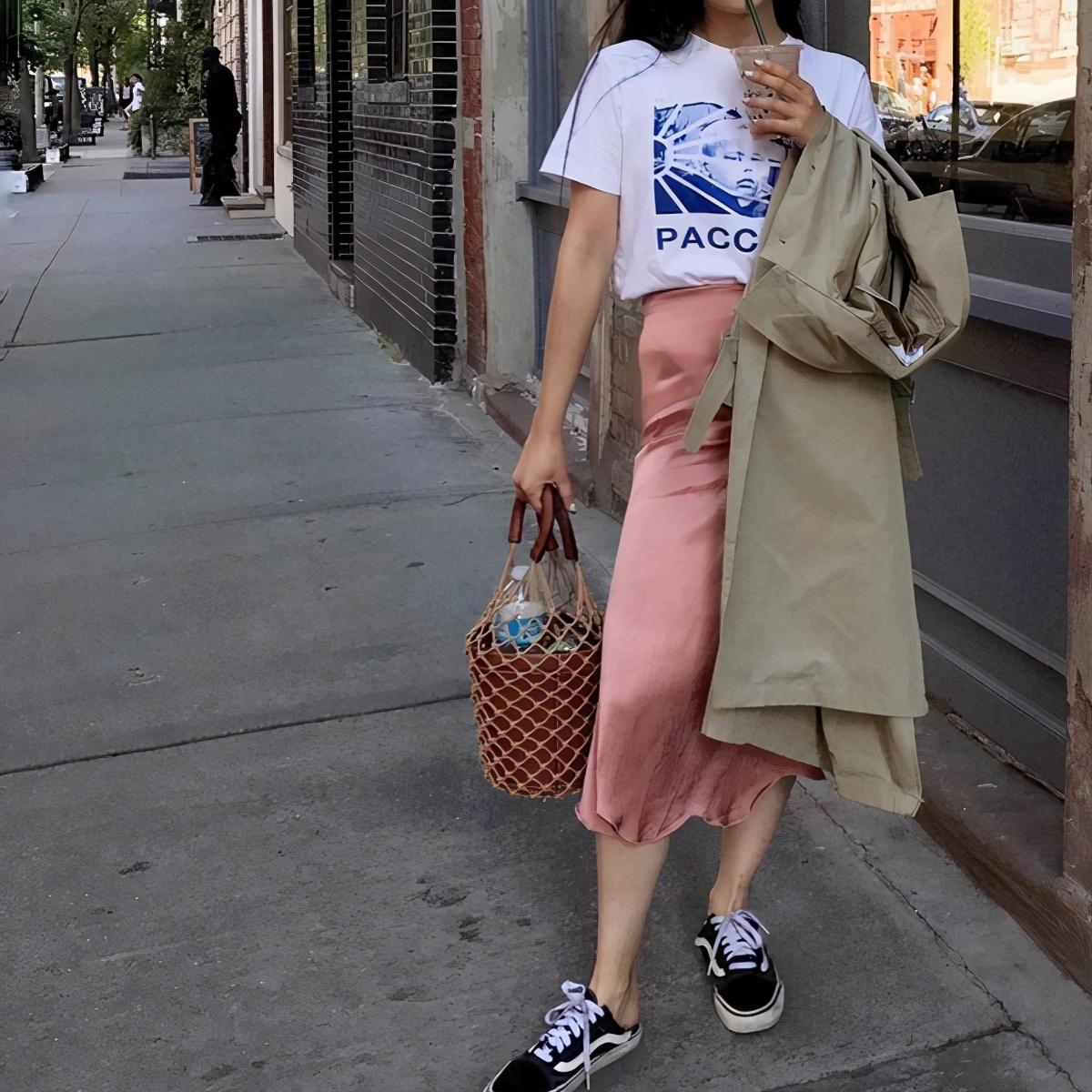 Wearing a T-shirt alone is really super good-looking. Not only does it reveal your slim waist, but it also looks very girly. If the weather is a little cooler at night, you can also pair it with a jacket, which is really comfortable and versatile.
