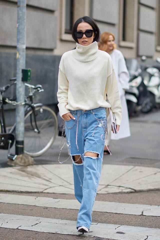 The temperature difference between morning and evening is particularly large in autumn. Turtlenecks are very versatile. A simple off-white turtleneck is paired with ripped jeans or specially designed jeans. The decoration is simple and unique, very trendy and beautiful.