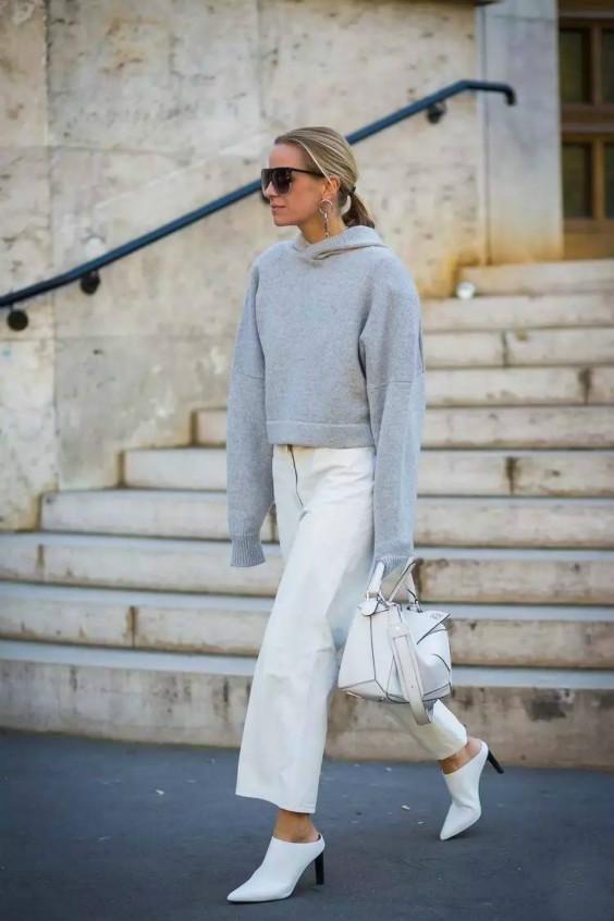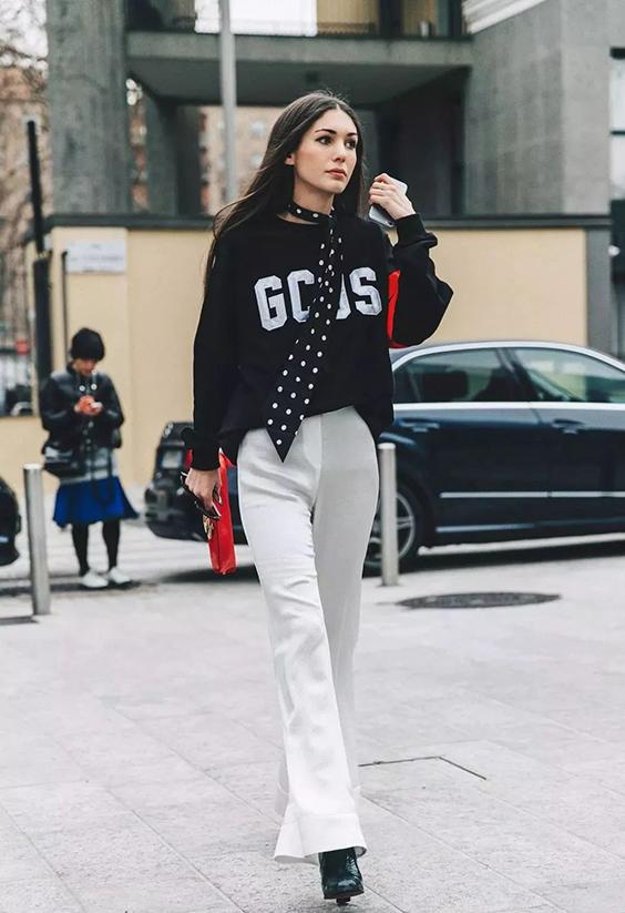 The combination of lazy and casual sweatshirt and solid color wide-leg pants is also perfect. The simple and elegant style is suitable for many occasions. , white wide-leg pants are refreshing and age-reducing. Paired with a colorful sweatshirt, it can create a distinct look. It is full of high-end and easy to control. It is very suitable for commuting wear. Paired with a pair of pointed high heels, it is neat and sophisticated. However, it should be noted that with this kind of matching, you should also pay attention to tucking in the corners of your clothes, otherwise your good figure will become half and half, making you look short and fat.