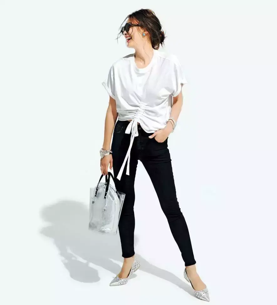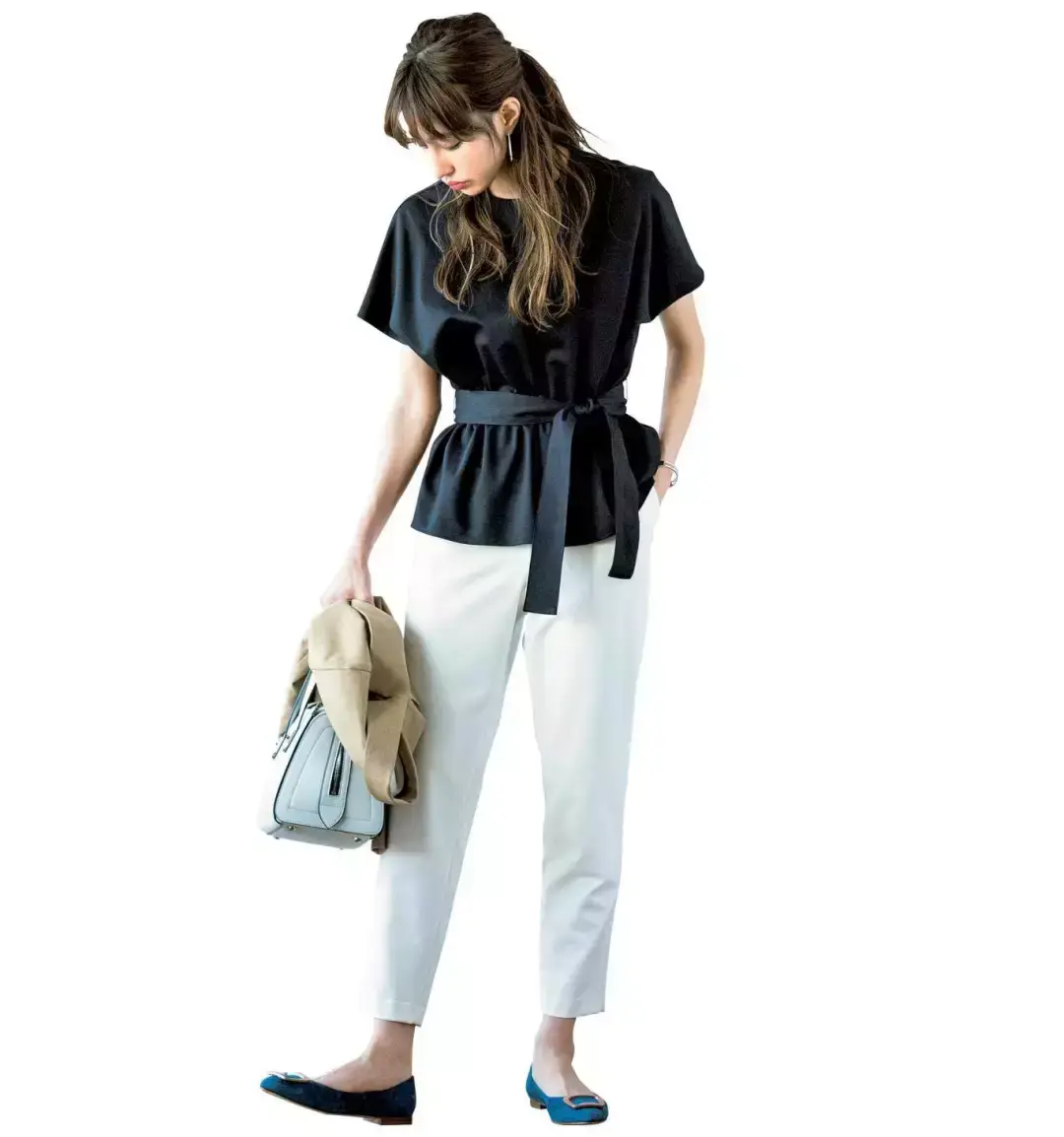 It goes without saying that the blouse-style T-shirt covers the flesh better than the basic style, and the style with a belt is even more of a white + black style combination. The loose fit is comfortable to wear, and the silhouette can be tightened with a belt to show a smart look.