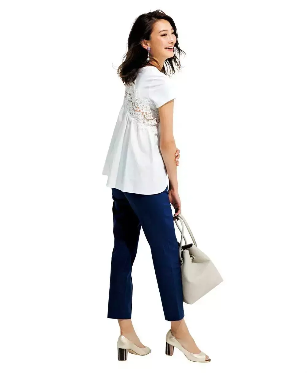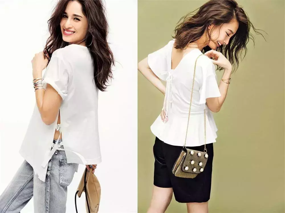 The feminine lace design is also integrated into T-shirts this season. The sexy look behind the elegant white T-shirt is unforgettable. The short front and long back design has the effect of covering up the shortcomings of the figure.