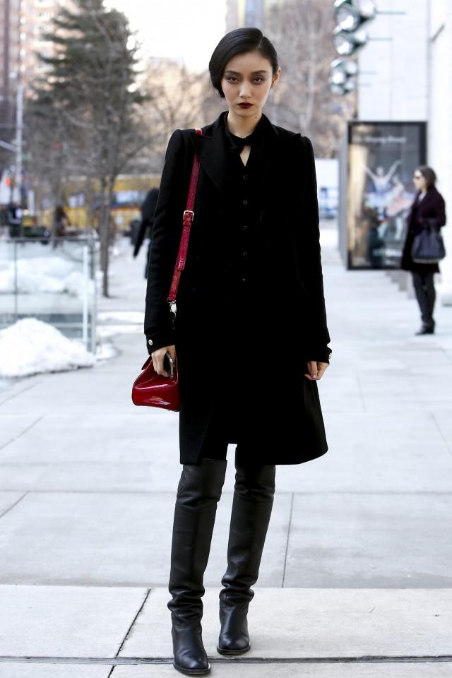 The waist-cinching effect can give you a curvy figure. The loose hem of the top makes the body lines wider and hides the belly fat very well, killing two birds with one stone. High-heeled pointed-toe shoes will make you look slimmer, and black Martin boots will make you look more classy. They are both good and successful dressing examples.