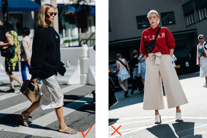 “Wide at the top and loose at the bottom” does not mean that the looser the better, You still have to master a degree. You should choose bottoms with good drape on the left in the picture above. The natural fall has a sense of elegance and lightness. The outward-expanding lines like the one on the right are too tough, and their ability to enhance femininity is obviously lower than that in the picture on the left. .