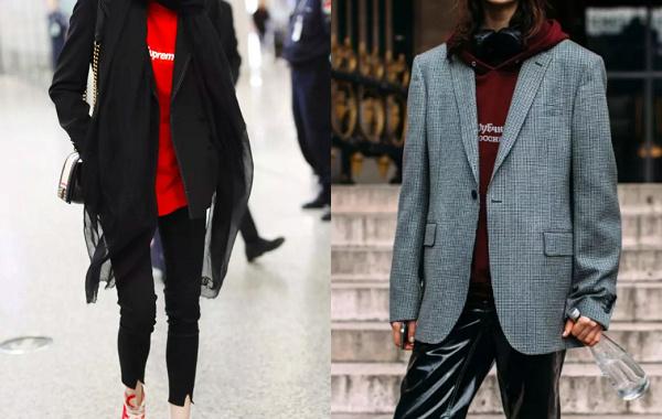 The suit is paired with a sweatshirt, which is neat and has a bit of youthful childishness. It reduces the maturity of the suit and adds a sense of maturity. A sense of leisure.