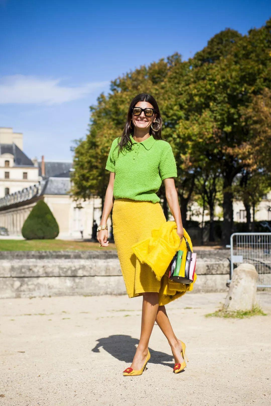 I want to take a safe route, but also want the color to stand out. You can choose a brightly colored short skirt, match it with a top that matches the color, and simple shoes in a simple color. The effect is great and you can’t go wrong.